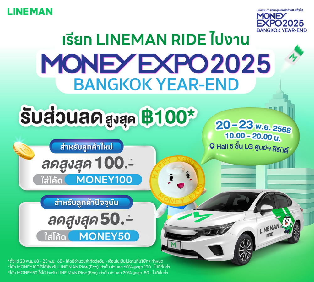 • ลูกค้าใหม่ / ใช้ LINE MAN ECO ครั้งแรก ลด 60% สูงสุด 100 บาท ใส่โค้ด MONEYEXPO100