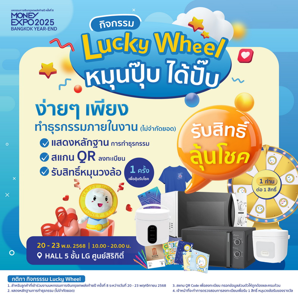 ร่วมลุ้นเครื่องใช้ไฟฟ้าจัดเต็มแบบของจริง! เพียงทำธุรกรรมใดก็ได้ภายในงาน (ไม่จำกัดยอด) แล้วนำหลักฐานมาโชว์ที่บูธกิจกรรม รับทันที 1 สิทธิ์หมุนวงล้อ ลุ้นของรางวัลสุดปัง