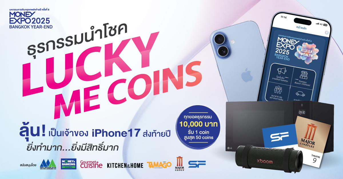 อย่าพลาด! กับธุรกรรมนำโชค “Lucky ME Coins” ทำธุรกรรมในงาน Money Expo 2025 Bangkok Year-End ปีนี้ลุ้นใหญ่กว่าเดิม! มีสิทธิ์รับ iPhone 17, เครื่องใช้ไฟฟ้า และของรางวัลอีกเพียบ