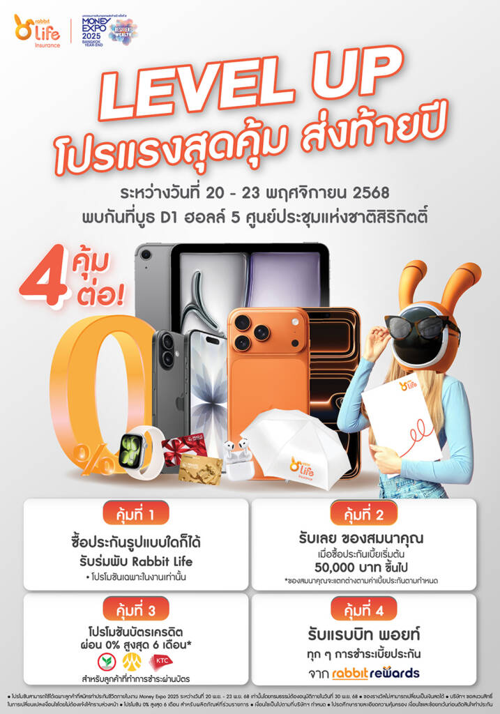 • โปรโมชันสามารถใช้ได้เฉพาะลูกค้าที่สมัครทำประกันชีวิตภายในงาน Money Expo 2025 ระหว่างวันที่ 20 พ.ย. – 23 พ.ย. 68 เท่านั้น โดยกรมธรรม์ต้องอนุมัติภายในวันที่ 30 พ.ย. 68